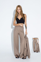Свободные женские брюки со стрелками и боковыми карманами из плотного гладкого трикотажа интерлок. Застегиваются на молнию и кнопку. Низ обработан плоскими швами.
