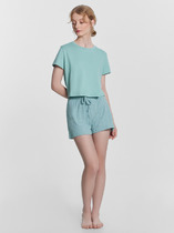 Легкий комплект для комфортного сна и отдыха. Свободная футболка с принтом и спущенной линией плеча комфортно садится по фигуре. Укороченные брюки с удобными боковыми карманами выполнены из набивного трикотажа. Гладкий материал приятен к телу и позволяет коже дышать.