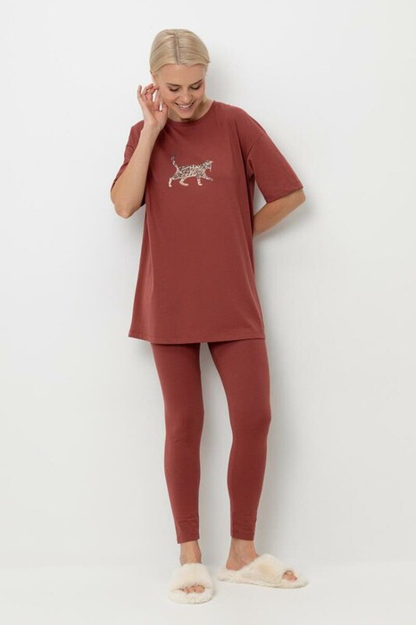 Комплект для сна и отдыха из натурального хлопка. Удлиненная футболка комфортно садится по фигуре. Бриджи из трикотажа с добавлением лайкры с мягким поясом на резинке.