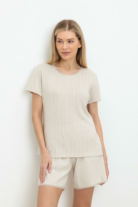 Комплект для комфортного сна из натурального хлопка. Футболка стандартной длины отделана эластичным кружевом. Шорты с мягким поясом на резинке удобно садятся по фигуре.