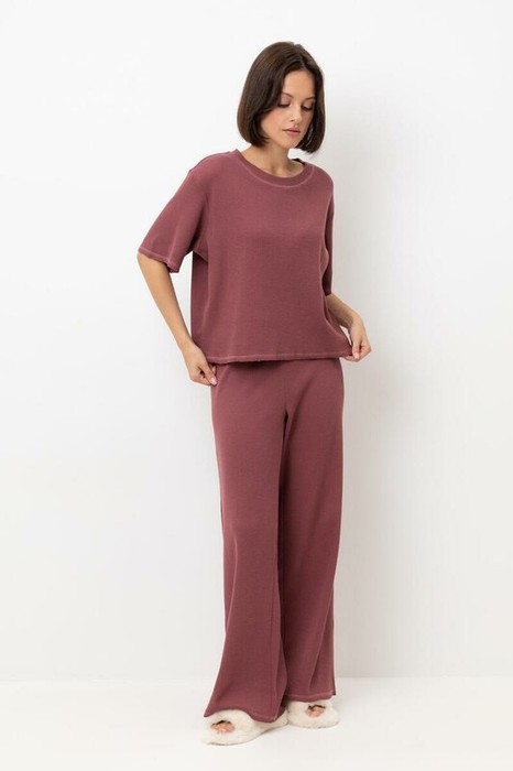 Комплект из объемного трикотажа с добавлением эластичных волокон. Свободный силуэт, мягкий пояс и отсутствие боковых швов на брюках обеспечат комфорт во время сна и отдыха.