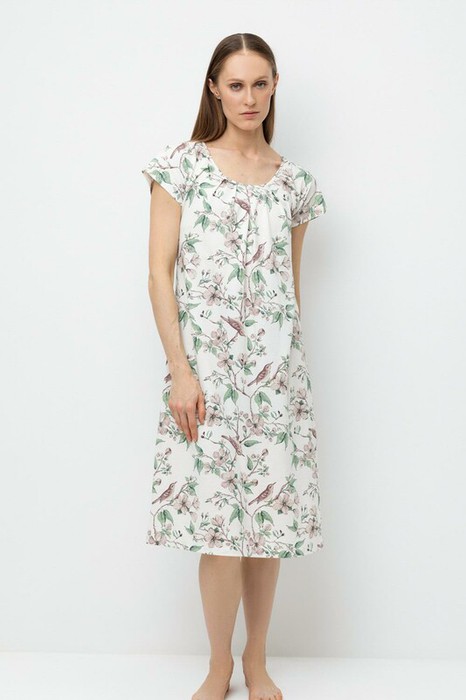 Уютная удлиненная сорочка с короткими рукавами из 100% натурального хлопка. Выполнена из набивного трикотажа супрем с нежным рисунком. Застроченные складки создают дополнительный объем. Все трикотажные полотна производятся в соответствии с нормами Швейцарского сертификата ЭкоТекс. Сделано в России
