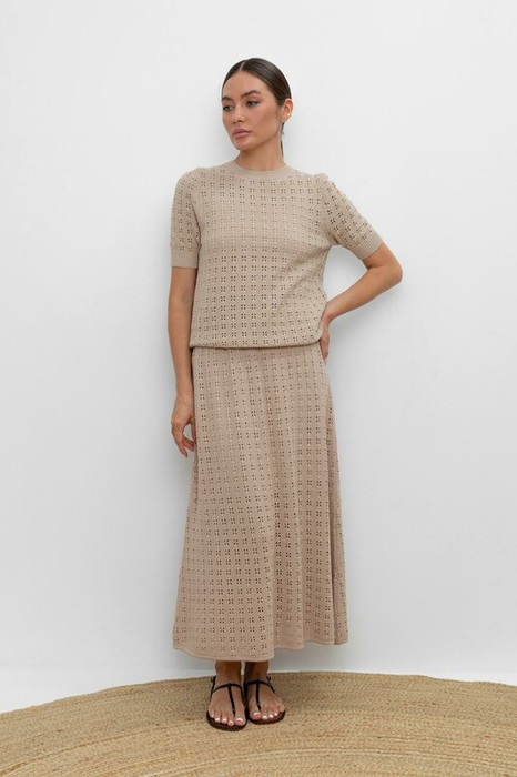 Вязаная ажурная юбка макси с подкладом. Состав 50% хлопок, 50% акрил. Благодаря акрилу в составе изделие не пилингуется.