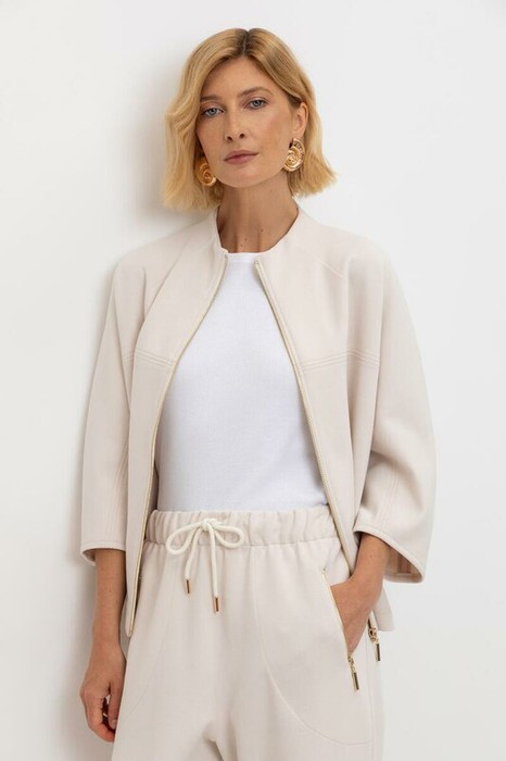 Жакет из высококачественного трикотажного полотна. За счет фактуры переплетения и специальных обработок сохраняет силуэт и форму. Хлопок в составе добавляет комфорт при носке. В сочетании с брюками из этой коллекции вы создадите расслабленный образ для летних дней.