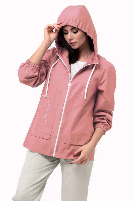 Жакет женский без подкладки на молнии с копюшоном и накладными карманами по переду. Правый карман декорирован печатью. Рукав реглан, по низу резинка. Спинка с кокеткой и частично вставленной резинкой. Длина жакета 68 см. Длина рукава от горловины 70 см