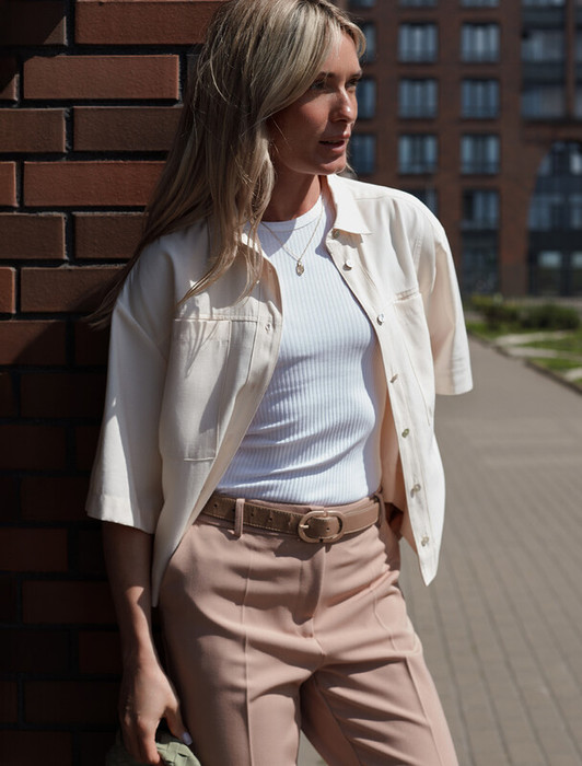 Блузка выполнена из плотного лиоцелла. Свободная модель с застежеой на пуговицы. Ткань изделия отлично держит форму и не просвечивает. В теплое время года приятно охлаждает кожу. Добавление синтетических волокон в составе изделия, предотвращает сминаемостьи поддерживает формоустойчивость. Жилет сочетается в костюме с брюками D24.261, D24.267, D24.265, юбкой D24.261, D26.196, шортами D27.002.