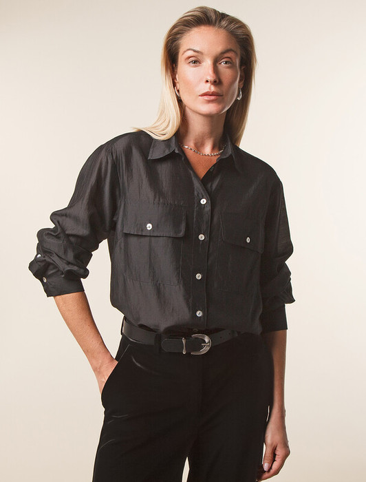Блузка выполнена из полупрозрачного лиоцелла с эффектом шелка. Праздничная и переливающаяся фактура ткани изыскано играет в вечернем освещении. Легкая и почти невесомая модель, приятно ощущается на теле. Застежка на пуговицы из натурального перламутра, подчеркивает роскошь.