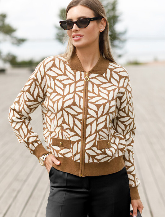 Бомбер жаккардовой вязки выполнен из нежной пряжи на основе вискозы с добавлением кашемира. Мягкая модель с золотистой фурнитурой не раздражает кожу, приятно ощущается на теле и поддерживает комфортный микроклимат. Совет стилиста: трендовая модель эффектно впишется в сдержанный образ, добавив образу выразительности. Сочетайте с однотонными брюками, юбкой, платьем или джинсами