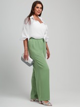 Брюки-палаццо выполнены из костюмной ткани. Свободная модель дополнена карманами и поясом на резинке сзади. Посадка на талии и заутюженные стрелки визуально удлиняют ноги и вытягивают силуэт. Идеальный вариант для офисного дресс кода или в повседневный классический стиль.
