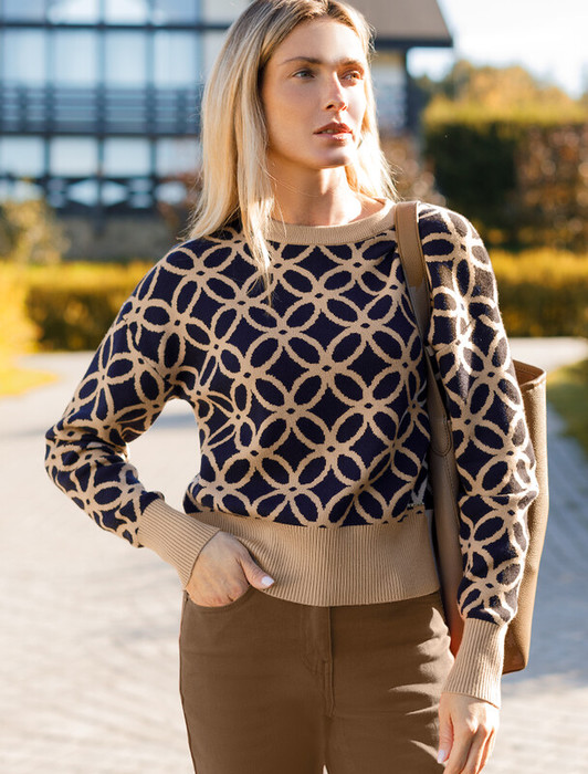 Джемпер жаккардовой вязки выполнен из мягкой пряжи на основе вискозы с добавлением кашемира. Очень приятная на ощупь пряжа дарит абсолютный комфорт, сохраняя оптимальную температуру не перегревая. Совет стилиста: модель с круглым вырезом и спущенной линией плеч гармонично дополнит повседневные образы с джинсами или брюками, при этом будет также выигрышно сочетаться с юбкой в заправку.