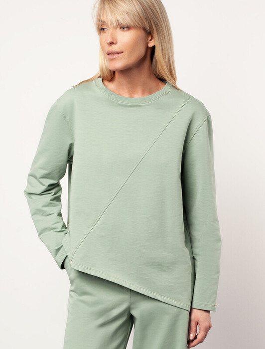 Ассиметричный джемпер выполнен из премиального футера двухнитки. Спущенная линия плеча поддерживает расслабленный образ, который особенно хорошо будет сочетаться в костюме с брюками D44.122, D44.123 и D44.128. Наличие эластана в составе изделия гарантирует идеальную посадку и комфорт.