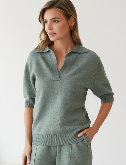 Джемпер с воротом планкой как у поло выполнен из мягкой пряжи с кашемиром. Модель с коротким рукавом свободного силуэта. Благодаря своей универсальности подойдет для любого гардероба и в офисный дресс-код. Мягкая пряжа очень приятная к телу, поддержит комфорт на протяжении всего дня, при этом не перегревая. Сочетается в костюме с брюками D38.013, D38.012 и юбкой D36.016