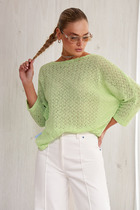 Джемпер с вырезом лодочкой и прозрачными рукавами создает женственный и элегантный образ. Тело джемпера черного цвета выполнено из плотного вискозного трикотажа, обеспечивающего комфорт, в то время как рукава из тонкой сетки создают стильный контраст. Глубокий вырез лодочка подчеркивает линию плеч и создает элегантный силуэт. Идеальный выбор для стильных образов!