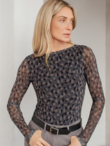 Джемпер с вырезом лодочкой и прозрачными рукавами создает женственный и элегантный образ. Тело джемпера черного цвета выполнено из плотного вискозного трикотажа, обеспечивающего комфорт, в то время как рукава из тонкой сетки создают стильный контраст. Глубокий вырез лодочка подчеркивает линию плеч и создает элегантный силуэт. Идеальный выбор для стильных образов!