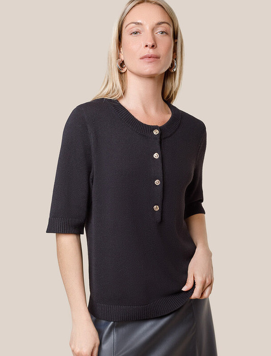 Джемпер тонкой вязки выполнен из хлопка с добавлением кашемира. Модель с круглым вырезом дополнена золотистыми пуговицами. Мягкая и очень приятная пряжа совершенно не колется, сохраняет тепло при этом не перегревая, гарантируя безупречный комфорт.