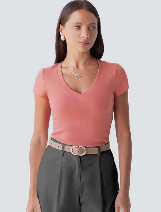 Облегающая футболка с V-образным вырезом цвета фуксия создаст утонченный образ. Идеальная базовая модель для вашего гардероба!  Глубокий V-образный вырез подчеркивает линию шеи и зрительно удлиняет силуэт. Футболка выполнена из хлопка с добавлением эластана, которая мягко облегает контуры тела, подчеркивая достоинства фигуры. Универсальный вариант для создания стильных повседневных образов.