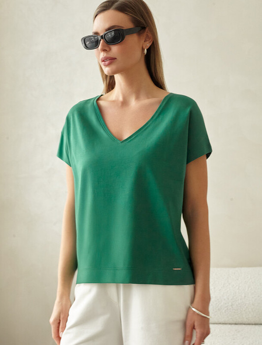 Футболка с цельнокроеным рукавом выполнена из премиального хлопка. Базовая однотонная модель идеально впишется в любой гардероб. V-вырез подчеркивает ключицы и удлиняет шею, хорошо сочетается с жакетами или кардиганами. Изделие дополнено металлическим логотипом бренда.