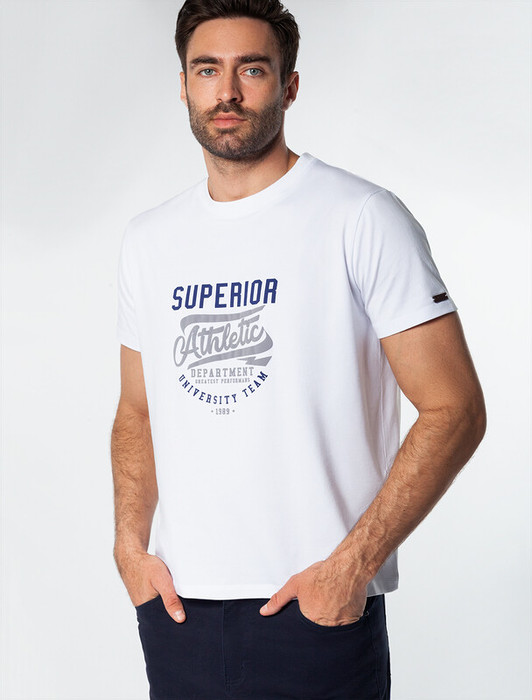 Совместные покупки Курган Мужская одежда Футболки — Vilatte Футболка из премиального хлопка с авторским принтом U49.026 белый_athlet