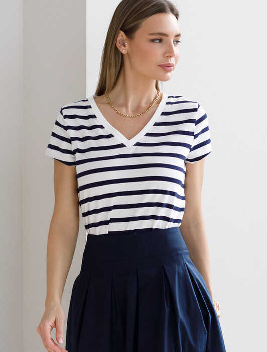 Футболка с V-образным вырезом выполнена из премиального хлопка. Добавление эластана в состав изделия способствует формоустойчивости. Самое высокое качество длинноволокнистых хлопковых волокон обеспечивает комфорт в любое время года. Изделие дополнено металлическим логотипом бренда.