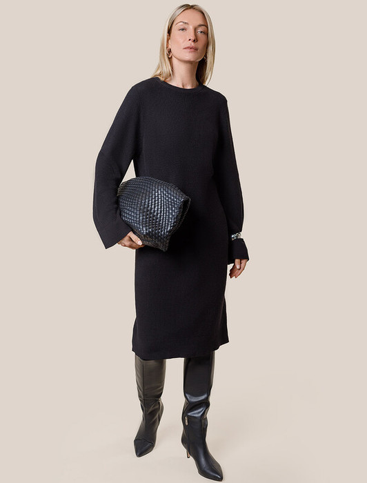 Платье прямого силуэта фактурной вязки выполнено из хлопка с добавлением кашемира.