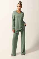 Прямые брюки выполнены из велюра. Модель с широким поясом дополнена шнурком из репсовой ленты и серебристой фурнитурой. Легкий и мягкий материал с матовой фактурой придает изделию нежность и комфорт. Хорошо держит тепло и форму – идеальное решение для домашнего отдыха. Сочетается в костюме с худи D49.053