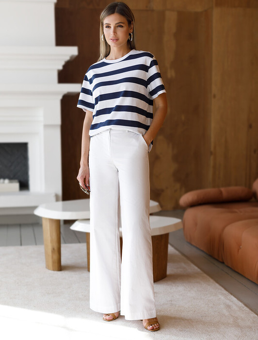 Широкие прямые брюки выполнены из плотного поплина. Натуральный состав ткани обладает высокой воздухопроницаемостью, а также способностью поглощать и отдавать влагу. Подходит для повседневной носки, гарантируя абсолютный комфорт, особенно в жаркое время года. Классическая модель с карманами впишется в любой гардероб.