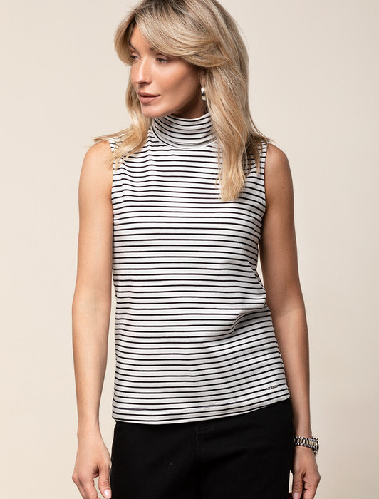 Топ с воротом как у водолазки выполнен из премиального хлопка. Наличие эластана в составе изделия способствует формоустойчивости. Модель хорошо будет сочетаться в комплекте с жакетом или кардиганом, так как отсутствие рукавов позволит комфортное использование в многослойных образах. Из украшений металлический логотип бренда.