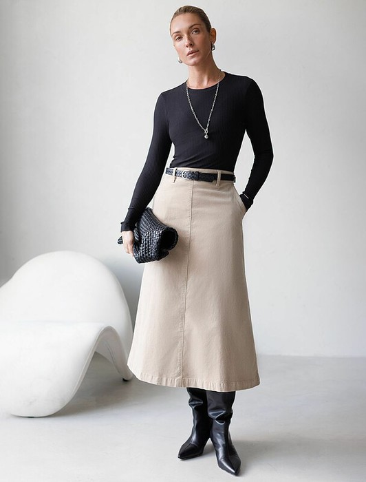 Юбка-миди трапециевидного силуэта выполнена из мягкого хлопкового микро-вельвета с добавлением эластана. Изделие комфортно садится по фигуре и не сковывает движения. Модель дополнена высококачественной фурнитурой с фирменным логотипом бренда. Хорошо комбинируется с вязаным трикотажем, блузками и денимом.Также прекрасно станет альтернативой деловым низам в нестрогом офисном дресс-коде.