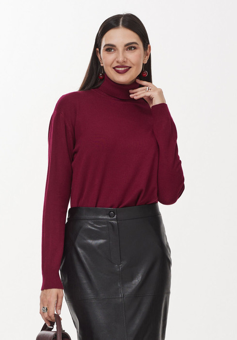 Джемпер-водолазка цвета бургунди из мягкого трикотажного полотна — отличный вариант для всех женщин, предпочитающих яркие цвета. По своим качествам, свойствам и тактильным восприятиям не уступает натуральному кашемиру. Джемпер с высокой горловиной и длинным рукавом с манжетой обеспечит вам комфорт и тепло в холодные дни, сохраняя при этом модный образ. Джемпер длиной до середины бедра. Приталенный крой прекрасно смотрится в сочетании со свободным или облегающим низом – можно выбрать узоры или однотонный рисунок. Такой элегантный джемпер также хорошо сочетается с костюмом, эффектно оживляя классический гардероб