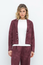 Жакет с застёжкой спереди на петли и пуговицы, с пиджачным воротником и втачными двухшовными рукавами со шлицами и акцентными пуговицами. По переду выполнены боковые накладные карманы и нагрудный накладной карман с вышивкой, по боковым деталям переда три отделочные детали, спинка со швами. По деталям жакета проложены отделочные строчки контрастного цвета.