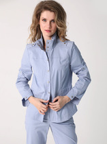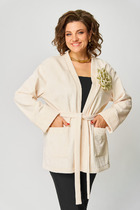 Жакет прямого силуэта, на подкладке. Воротник стояче-отложной пиджачного типа. По переду - двубортная застежка на петли и пуговицы, нагрудные вытачки и накладные карманы. Спинка со средним швом. Рукав втачной длинный двухшовный. Полочку жакета украшает декоративная съемная рюша на пуговицах.