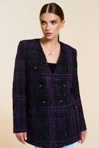 Укороченный жакет выполнен из фактурного полотна с вкраплением люрексовой нити. Характеристики: укороченный, подкладка, подплечники, отложной воротник с лацканом, застежка центральная на петлю пуговичку, пуговичка декорирована тканью основного изделия, рукав втачной по низу рукава разрез. Длина по спинке 45 длина рукава 61