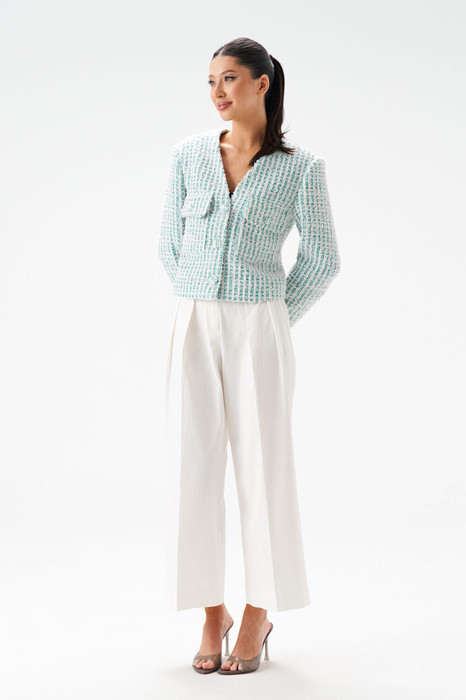 Жакет полуприлегающего силуэта выполнен из яркого текстурного полотна мятного цвета, с декоративными элементами. Характеристики: V образный вырез горловины, застежка центральная на петли пуговицы (декорированы тканью основного изделия), талиевые вытачки по спинке жакета, по переду два накладных кармана с клапанами, рукав прямого кроя. Длина по спинке 48 см, длина рукава 63 см.