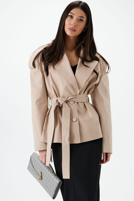 Жакет прямого кроя выполнен из полотна бежевого цвета. Характеристики: прямой крой, покладка, подплечники, отложной воротник с остроугольным лацканом, застежка центральная на петли пуговицы, по линии талии шлевки, в комплекте пояс из ткани основного изделия, рукав втачной. По линии плеча погон с пуговицей, в среднем шве заднего полотна изделия шлица 17 см. В боковых швах изделия карманы. Длина по спинке 65 см, длина рукава 58 см.