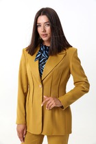 Жакет прямого кроя выполнен из эко-кожи черного цвета. Характеристики: прямой крой, покладка, подплечники, отложной воротник с остроугольным лацканом, застежка центральная на петли пуговицы, по линии талии шлевки, в комплекте пояс из ткани основного изделия, рукав втачной. По линии плеча погон с пуговицей, в среднем шве заднего полотна изделия шлица 17 см. В боковых швах изделия карманы. Длина по спинке 65 см, длина рукава 58 см.