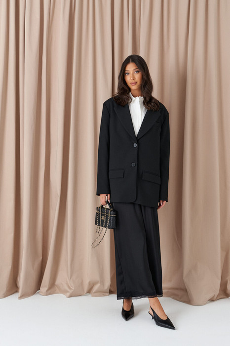 Жакет прямого свободного кроя выполнен из костюмной ткани черного цвета. Характеристики: прямой свободный крой, подкладка, подплечники, воротник с остроугольным лацканом, застежка центральная на петлю - пуговицу, по переду функциональные карманы с клапаном, на груди прорезной карман обманка, рукав втачной, спинка со средним швом, в среднем шве разрез 59 см с завязкой-бантом из ткани основоного изделия. Брендированная подкладка. Длина по спинке 76, длина рукава 62 см.