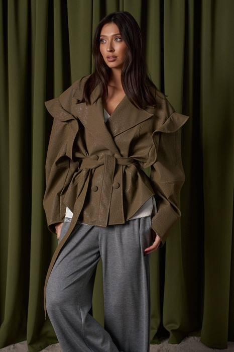 Жакет полуприталенного силуэта выполнен из текстильного полотна черного цвета. Характеристики: полуприталенный силуэт, двубортный, брендированная подкладка, подплечники, овальный вырез горловины, по переду функциональные карманы с клапаном, рукав втачной, по низу рукава нашиты пуговички. Длина по спинке 76, длина рукава 61 см.