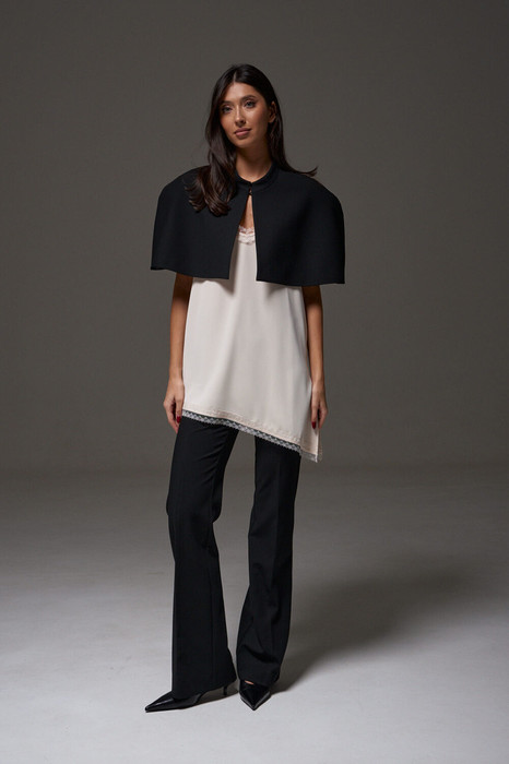 Кейп выполнен из костюмной ткани черного цвета. Характеристики: горловина стойка, застежка центральная на крючок, подплечники, брендированная подкладка. Длина по спинке 33см.