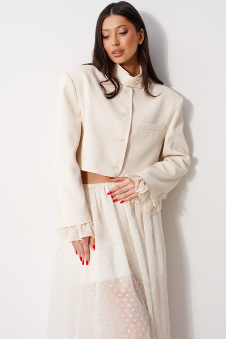 Жакет женский, прямого силуэта, укороченный, на подкладке. Характеристика: горловина стойка с хлястиком, застегивается на петлю с пуговицей. Застежка центральная бортовая, застегивающаяся на петли, пуговицы. Подплечники. Брендированная подкладка. Рукав втачной двухшовный, по низу рукава вставлена рюша из тонкой хлопковой ткани. Рюша притачная. По низу рукава нашиты пуговицы. Спинка с двумя рельефными швами. Длина жакета по спинке 43 см. Длина рукава без рюши 63 см.