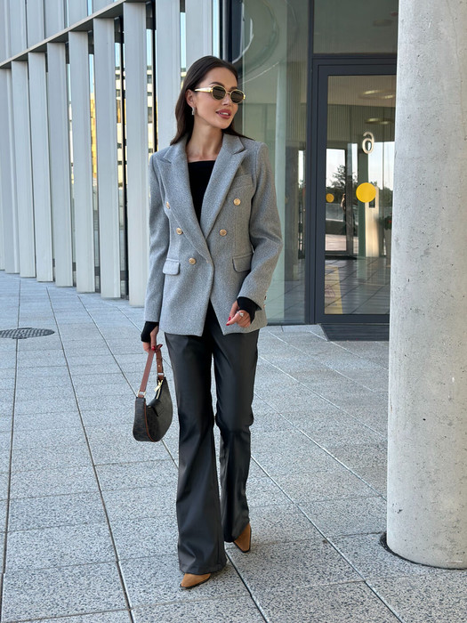 Двубортный жакет на подкладке, прямого силуэта.. Жакет выполнен из плотной пальтовой ткани. Обработаны прорезные карманы по переду. Рукава втачные одношовные, обработаны шлицей