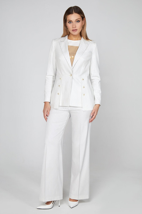 Легкий и повседневный вариант для весны! После долгих зимних месяцев с первыми теплыми днями хочется легких нарядов. Соответственно, этот светлый пиджак в тонкую полоску является обязательным элементом гардероба модницы, который образует шикарный ансамбль с соответствующими брюками широкого кроя. Эта модель из поливискозной испанской ткани спрямлённого силуэта впечатляет интересными элементами в виде отделочных шлиц с пуговицами по переду, спинке и рукавам , застежкой на одну пуговицу в шве по линии талии и необычной задумкой линии низа. А также дополнен классической формой лацканов с отложным воротником и функциональными карманами в боковых швах. На подкладке.