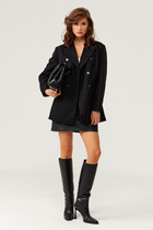Жакет женский удлиненный, из трикотажной ткани, перед жакета на подкладке, полуприлегающего силуэта с центральной бортовой застежкой на пуговицы до линии перегиба лацкана. Спереди рельефные швы от плечевого шва, отрезной бочок и карман с клапаном. Спинка с рельефами от плечевого шва. Рукав втачной, двухшовный. Воротник пиджачного типа. Длина по спинке 70, длина рукава 61.