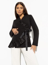 Жакет женский удлиненный, полуприлегающего силуэта с центральной бортовой застежкой на пуговицы до линии перегиба лацкана. Спереди рельефные швы от плечевого шва, отрезной бочок и карман с клапаном. Спинка с рельефами от плечевого шва. Рукав втачной, двухшовный, 3/4, с небольшим разрезом в локтевом шве. Воротник пиджачного типа. Жакет выполнен из джинсовой ткани. Перед жакета на подкладке. Длина рукава 50 см, длина по спинке 68 см