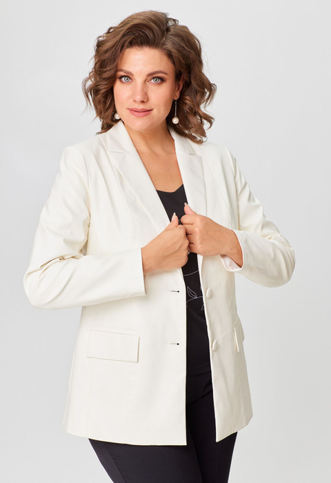 Жакет женский удлиненный, из экокожи, на подкладке, полуприлегающего силуэта с центральной бортовой застежкой на пуговицы до линии перегиба лацкана. Спереди рельефные швы от плечевого шва, отрезной бочок и карман с клапаном. Спинка с рельефами от плечевого шва. Рукав втачной, двухшовный. Воротник пиджачного типа. Длина по спинке 66 см, длина рукава 62 см.
