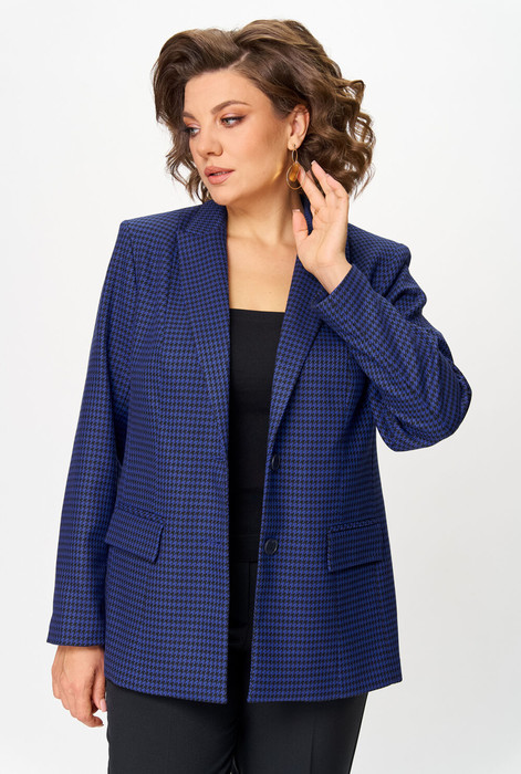 Жакет женский удлиненный, из текстильной ткани, на подкладке, полуприлегающего силуэта с центральной бортовой застежкой на пуговицы до линии перегиба лацкана. Спереди рельефные швы от плечевого шва, отрезной бочок и карман с клапаном. Спинка с рельефами от плечевого шва. Рукав втачной, двухшовный. Воротник пиджачного типа. Длина по спинке 66 см, длина рукава 62 см.