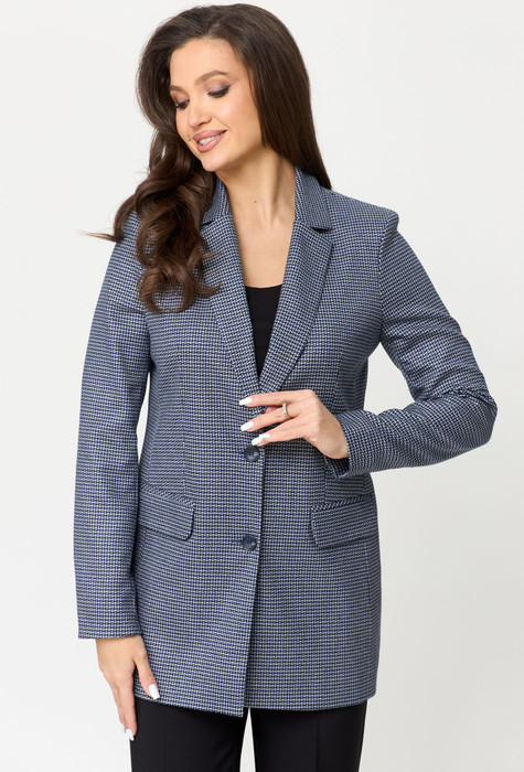 Жакет женский удлиненный, из текстильной ткани, полуприлегающего силуэта с центральной бортовой застежкой на пуговицы до линии перегиба лацкана. По переду имеется отрезной бочок и вертикальные вытачки. С прорезными карманами с клапаном и двумя обтачками. Спинка цельная. Воротник пиджачного типа. Рукав двухшовный, втачной. Жакет на подкладке. Длина рукава 63 см, длина по спинке 75 см.