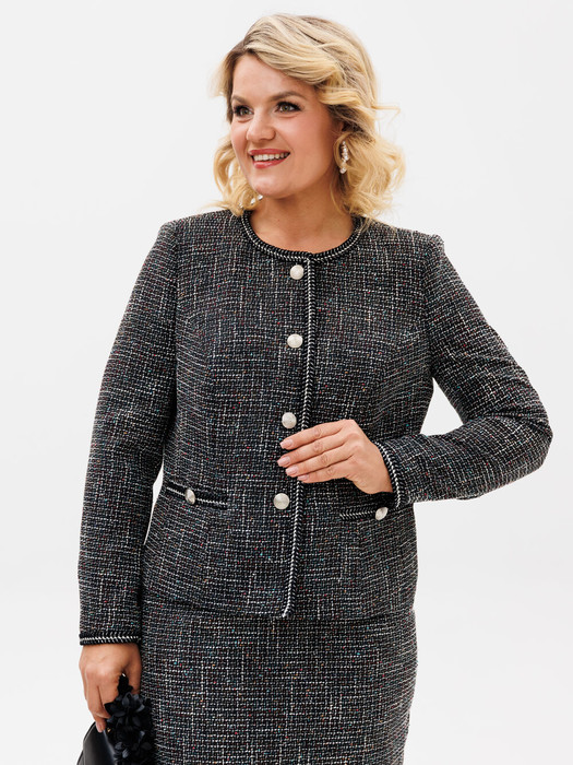 Жакет в стиле шанель – находка для вашего гардероба. Он выполнен в классическом стиле и подойдет под любого дресс-код. В нем уместно отправиться в офис, на мероприятие, ужин с партнерами. Жакета с длинным рукавом на пуговицах , с прорезными карманами. Декоратианая тесьма по горовине, центральной застежке, низу рукава и планках. Жакет большого размера хорошо садится по фигуре, визуально корректируя мелкие недостатки за счет расцветки.