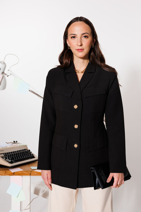 Жакет в стиле милитари – это изысканность и лаконичность в одном флаконе. Жакет приталенного силуэта с обрисованной талией. По переду расположены карманы с клапаном. Застежка центральная на дизайнерские золотые пуговицы. Сзади в среднем шве спинки расположена высокая шлица. По низу рукава, так же расположена шлица с пуговицей. Если вы хотите выглядеть роскошно – этот жакет для вас. Длина изделия – 70 см