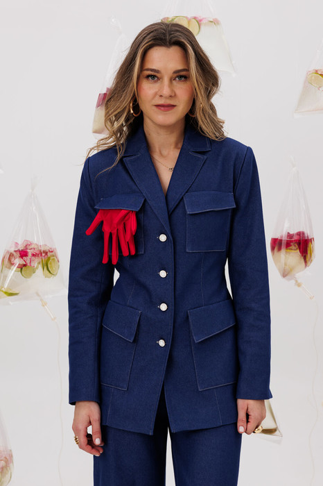 Приталенный жакет с накладными карманами. Жакет на подкладке. По переду в верхнем кармане декор из алых перчаток, которые можно носить для создания аристократичного образа. По спинке регулируемый пояс для более заталенного и женственного силуэта. Длина - 69 см.