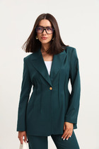 Двубортный жакет умеренного объема, полуприлегающего силуэта. Нагрудные вытачки на полочках расположены вертикально и совмещены с талиевыми, заканчиваются входом в карман. Карманы прорезные, в рамку с клапаном. Спинка имеет плечевые вытачки, средний шов со шлицей. Рукава двухшовные, длинные. Воротник – стойка переходит в край борта, имеющий V-образную форму. Застежка на прорезные петли и пуговицы. Жакет полностью обработан притачной подкладкой. Длина изделия до середины бедра. Длина по спинке 71 см, длина рукава 61 см.